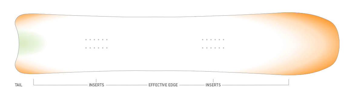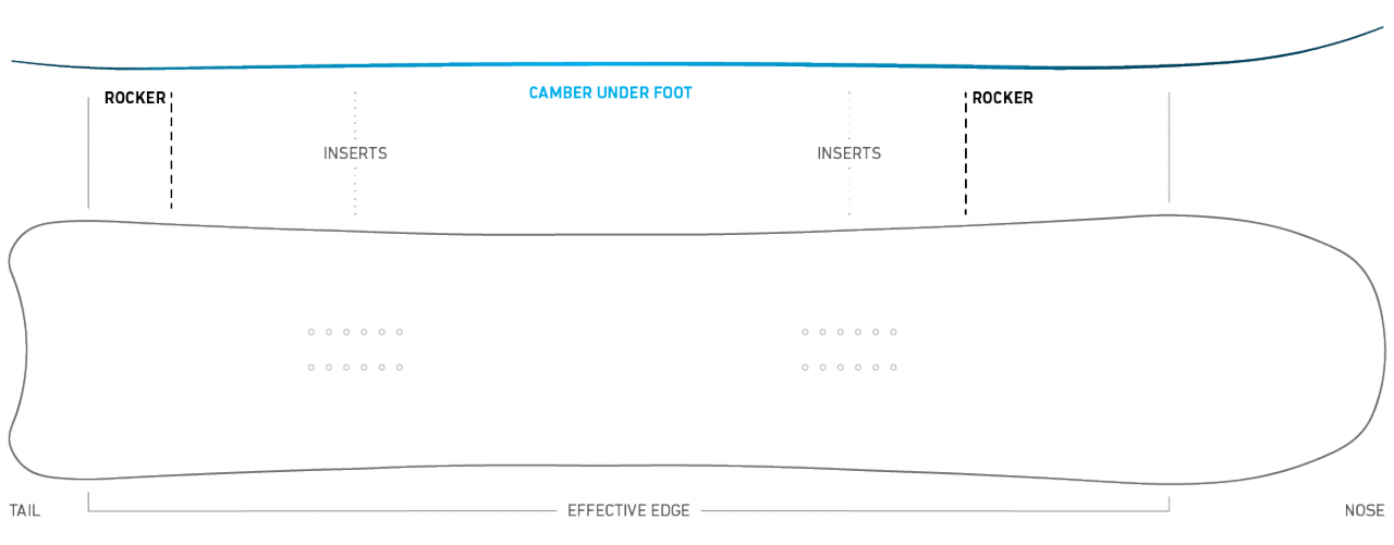A hybrid rocker/camber flex pattern defined by more tip rocker then tail rocker and camber between the bindings.